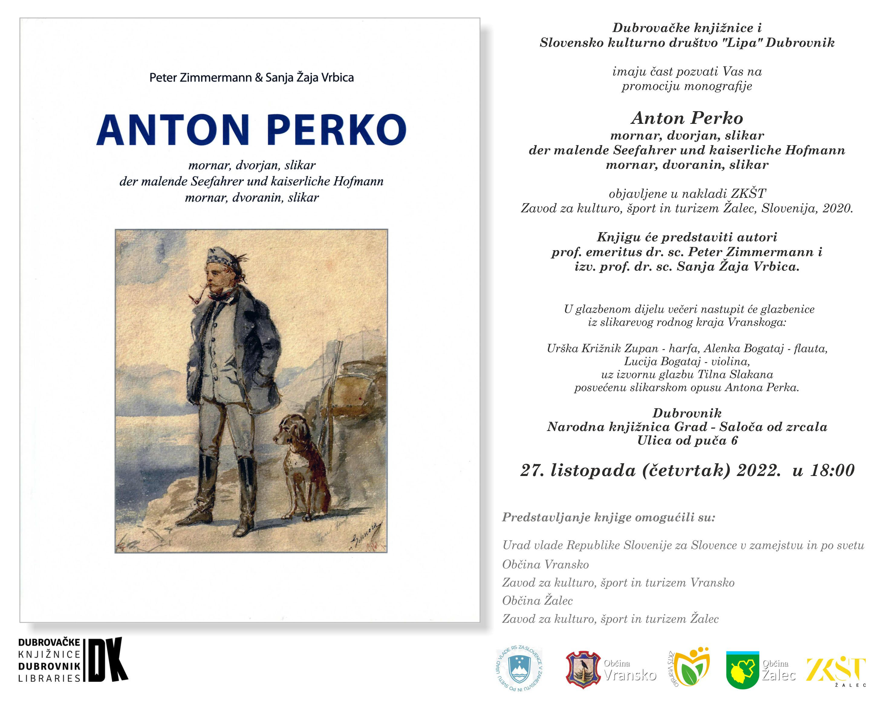 U suradnji s Dubrovačkim knjižnicama, a u okviru obilježavanja manifestacije Mjeseca hrvatske knjige, danas s početkom u 18 sati, u Čitaonici Narodne knjižnice Grad održat će se promocija monografije "Anton Perko - mornar, dvoranin, slikar" . Na predstavljanju sudjeluju autori prof. emer. dr. sc. Peter Zimmermann i izv. prof. dr. sc Sanja Žaja Vrbica uz pratnju glazbenica iz slikarevog rodnog kraja Vranskoga - Urške Križnik Zupan, Alenke Bogataj i Lucije Bogataj, uz izvornu glazbu Tilna Slakana posvećenu slikarskom opusu Antona Perka.