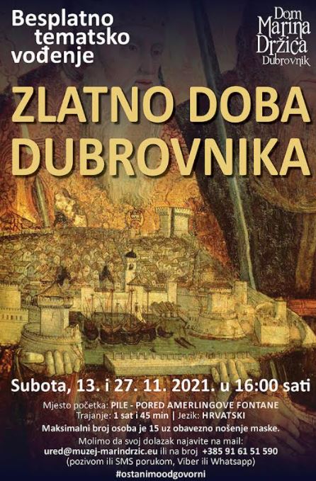 Dom Marina Držića organizira novo besplatno tematsko vođenje „Zlatno doba Dubrovnika“ za naše sugrađane i posjetitelje Grada. Nakon što se u prethodnim tematskim vođenjima upoznavo život i djelo Marina Držića, razni aspekti svakodnevnog života te suvremenici njegovog doba, u novom tematskom vođenju nastavlja se upoznavati svakodnevicu, ali i političku situaciju Dubrovnika tijekom 15. i 16. st., tj. njegovog „zlatnog doba“. To je vrijeme kad mala, ali važna Dubrovačka Republika zaokružuje svoj teritorij, gradi vodovod, pokreće suknarsku industriju te, kako bi osigurala političku stabilnost, jedno vrijeme plaća dva danka. Ne manje važno, materijalno blagostanje i osjećaj sigurnosti bili su plodno tlo za razvoj kulture i umjetnosti. Upravo tada Marin Držić piše i prvi put u Dubrovniku izvodi svoja dramska djela, inspiriran sugrađanima i ritmom gradske svakodnevice: dočekuju se strani gosti, ispraćaju poklisari harača, kažnjavaju prijestupnici, svečanosti se obilježavaju raznim ceremonijalima, ali i zabavom za puk.