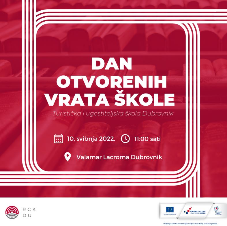 Turistička i ugostiteljska škola Dubrovnik, u sklopu projekta „Uspostava regionalnog centra kompetentnosti u turizmu i ugostiteljstvu Dubrovnik“ organizira Dan otvorenih vrata u hotelu Valamar Lacroma Dubrovnik. Budući da se bliži vrijeme donošenja važne odluke o izboru srednje škole pozivaju se svi učenici osmih razreda, njihovi roditelji i svi zainteresirani da se ovom prilikom upoznaju s obrazovnim programima i izvannastavnim aktivnostima koje se provode u Turističkoj i ugostiteljskoj školi Dubrovnik. Svi posjetitelji Dana otvorenih vrata imat će priliku upoznat se s mogućnošću stipendiranja učenika koje će prezentirati dubrovačke hotelske kuće: Valamar Dubrovnik, Jadranski luksuzni hoteli, Sheraton Dubrovnik Riviera i Dubrovački Vrtovi Sunca. Događanje će se održati 10. svibnja s početkom u 11 sati.