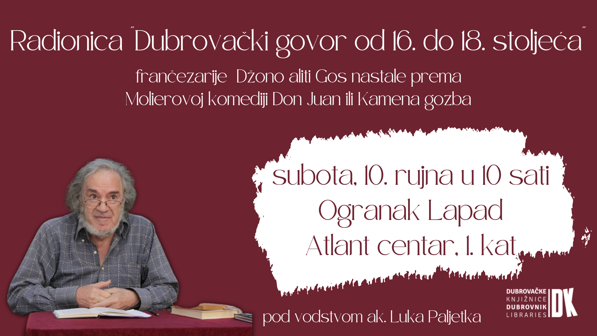 I ove godine Dubrovačke knjižnice organiziraju radionice „Dubrovački govor od 16. do 18. stoljeća“ pod vodstvom akademika Luka Paljetka. Radionice su osmišljene kao edukativni program za skupinu od petnaestak polaznika koji žele bolje upoznati dubrovačku kulturu i povijest, a osobito razvoj dubrovačkog govora kroz stoljeća. U ovom ciklusu polaznici će raditi na tekstu frančezarije Džono aliti Gos nastale prema Molierovoj komediji Don Juan ili Kamena gozba. U godini u kojoj se obilježava 400. obljetnica rođenja ovog velikog književnika, proučavat će se njegov utjecaj na dubrovačku književnost.