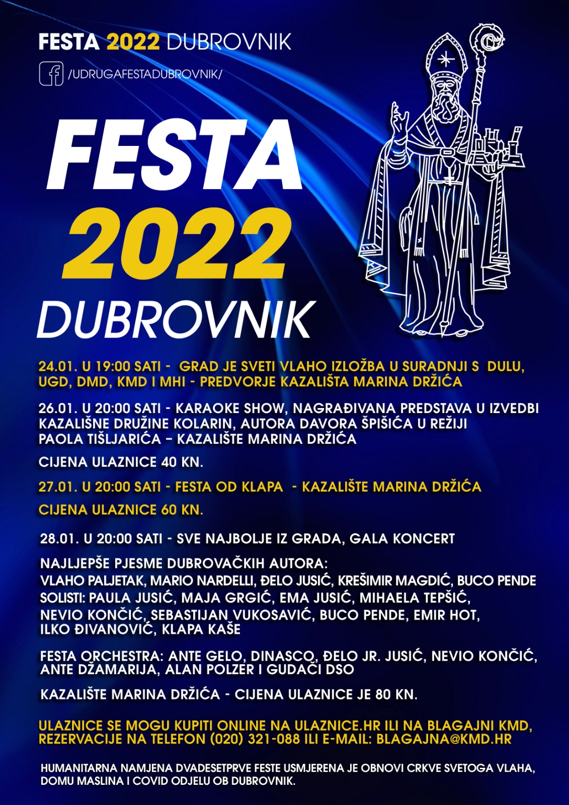 Ovogodišnja Festa Dubrovnik završava gala koncertom SVE NAJBOLJE IZ GRADA u petak 28.01. u 20:00 sati Pjevat će se najljepše pjesme dubrovačkih autora: Vlaha Paljetka, Maria Nardellia, Đela Jusića, Krešimira Magdića, Buca Pende. Solisti na koncertu bit će Paula Jusić, Maja Grgić, Ema Jusić, Mihaela Tepšić, Buco Pende, Nevio Končić, Sebastijan Vukosavić, Emir Hot, Ilko Đivanović, Klapa Kaše. Festa Orchestra: Ante Gelo, Dinasco, Đelo Jr. Jusić, Nevio Končić, Ante Džamarija, Alan Polzer i gudači DSO. Cijena ulaznice je 80 kn.