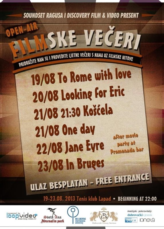 Od ponedjeljka 19. kolovoza do petka 23. kolovoza ljetne večeri Dubrovčana i gostiju začinili su filmski klasici; To Rome with love, Looking for Eric, One day, Jane Eyre i In Bruges.
