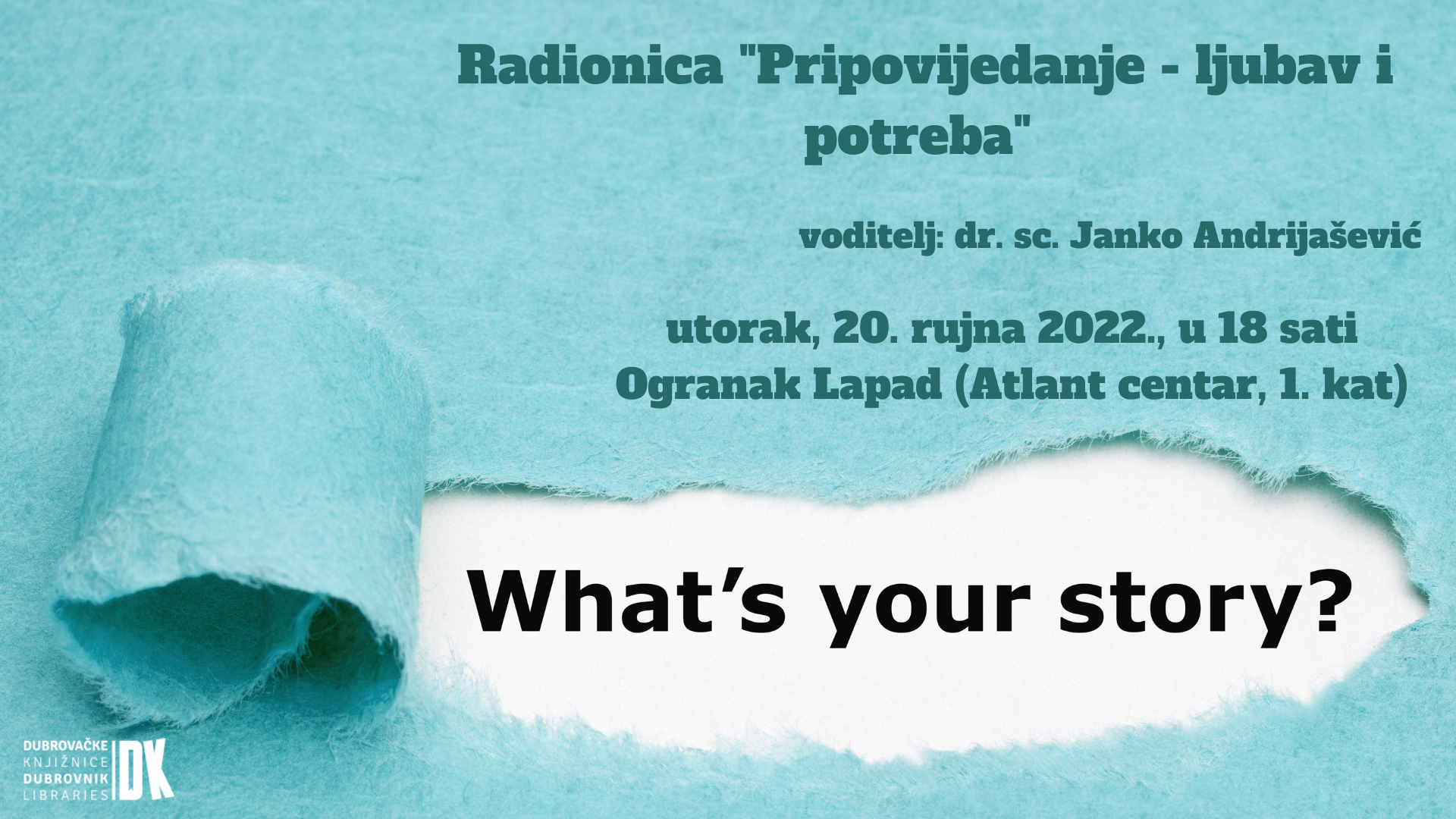 U organizaciji Dubrovačkih knjižnica kreće radionica “Pripovijedanje - ljubav i potreba”, koju će voditi dr. sc. Janko Andrijašević. Tema je upoznavanje sa prirodom univerzalne čovjekove sklonosti prema pripovijesti, a susreti će se održavati jednom tjedno sa trinaest tema: Homo fictus, Svrha priče, Priroda priče, Priča i biologija, Priča i san, Priča i ludilo, Priča, laž i istina, Priča i povijest, Priča i moral, Priča i pamćenje, Priča i biznis, Priča, mit i religija te Priča i smrt.
