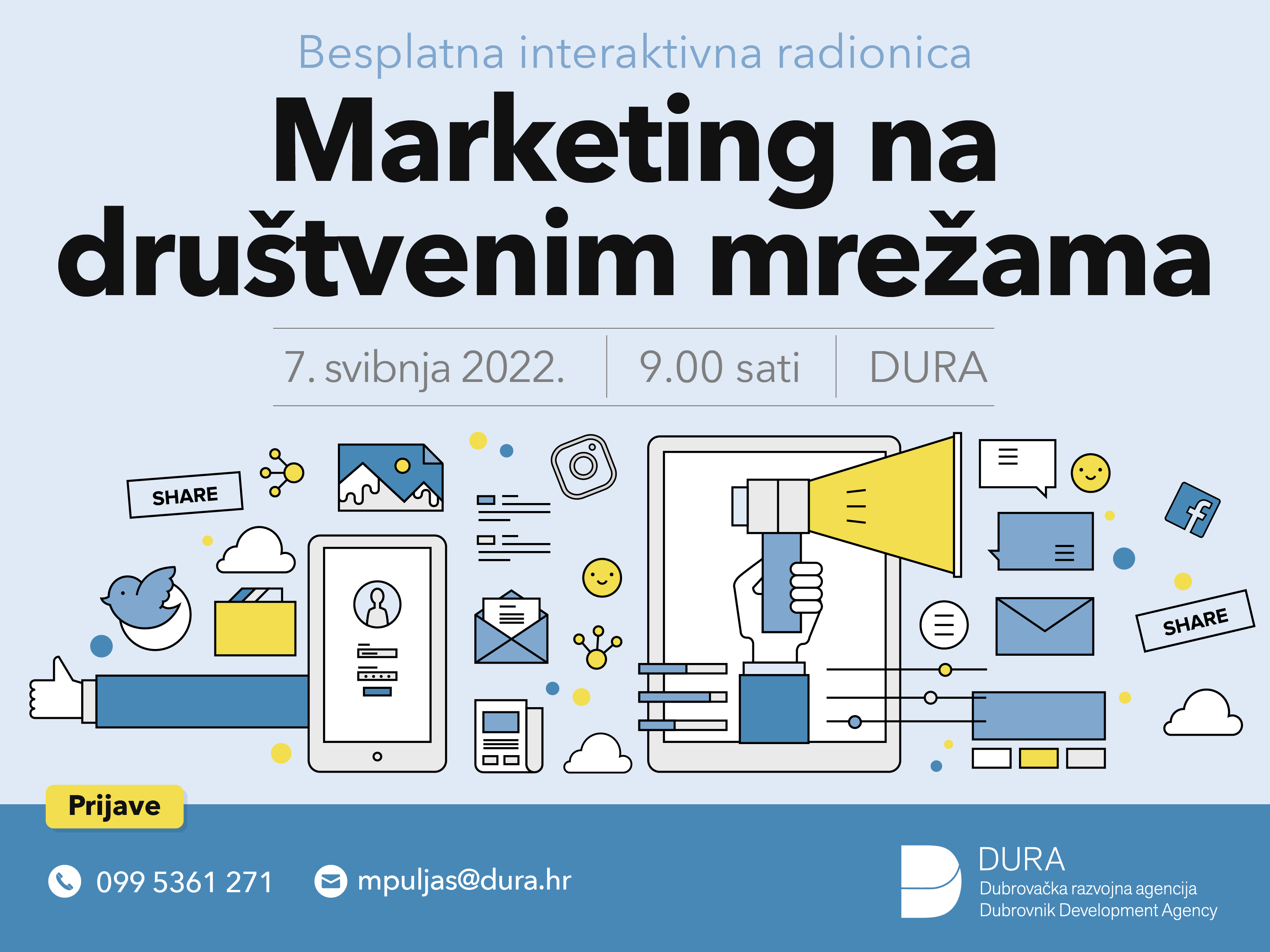 DURA organizira novu besplatnu radionicu. Ovoga puta tema je „Marketing na društvenim mrežama“ koja će zainteresiranima približiti najnovija saznanja u području internet marketinga na razumljiv, upotrebljiv i zabavan način.