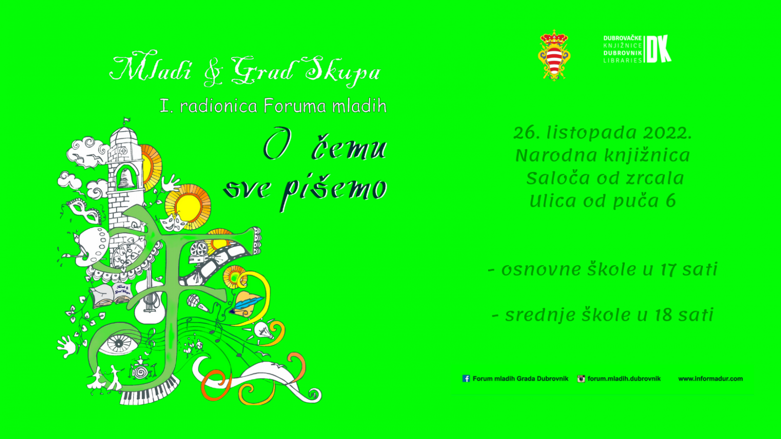 „O čemu pišemo“, prva radionica Foruma mladih u školskoj godini 2022/2023, održat će se u srijedu, 26. listopada, u Saloči od zrcala Dubrovačkih knižnica, a tom prilikom će se predstaviti učenički radovi nastali tijekom listopadskih radionica.