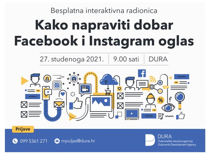 Kako bi naučili kako pronaći nove kupce putem Facebooka i Instagrama DURA organizira radionicu “Kako napraviti dobar Facebook i Instagram oglas”. Radionica će se održati u subotu, 27. studenoga 2021. godine u prostorijama DURA-e, na adresi Branitelja Dubrovnika 15, 20 000 Dubrovnik s početkom u 9 sati.