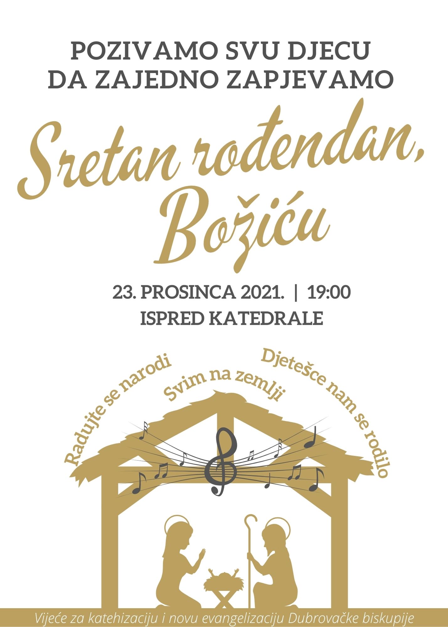 Vijeće za katehizaciju i novu evangelizaciju Dubrovačke biskupije organizira program „Sretan rođendan, Božiću“ u četvrtak, 23. prosinaca u 19.00 sati na prostoru ispred katedrale. Pozivaju se sva djeca koja žele i mogu da se uključe u ovaj program kako bi zajedno zapjevali Božiću. Želja organizatora je da se djeca od 5 – 14 godina pjesmom poklone malenom Isusu u jaslama.