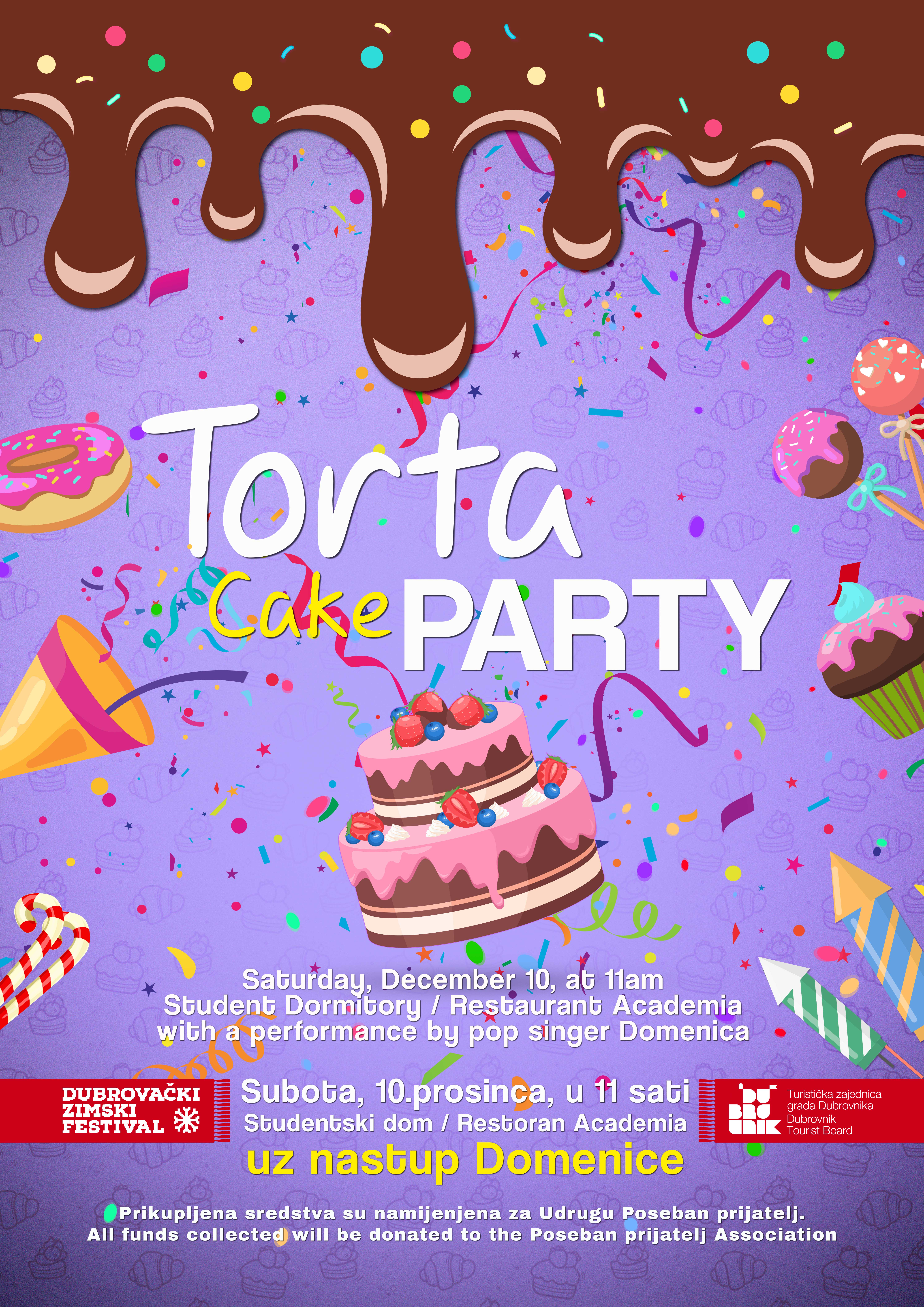 Turistička zajednica grada Dubrovnika tradicionalno organizira humanitarni „Torta party“, koji će se u okviru ovogodišnjeg Dubrovačkog zimskog festivala održati u subotu, 10. prosinca u Studentskom centru (domu) - Akademisu, s početkom u 11 sati, dok će prodaja bonova i izložba torti početi već u 10 sati.