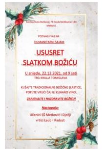 Manifestacija je humanitarnog karaktera jer će sav prihod od prodanih kolača, slastica, ukrasa za bor i ostalog što naprave i pripreme učenici te njihovi profesori iz Srednje škole Metković ići za Udrugu mladih o. Ante Gabrića. Na licu mjesta će se kuhati čaj i vino, te pripremati fritule, pa se možete ugrijati i osladiti uživajući u prigodnom programu.