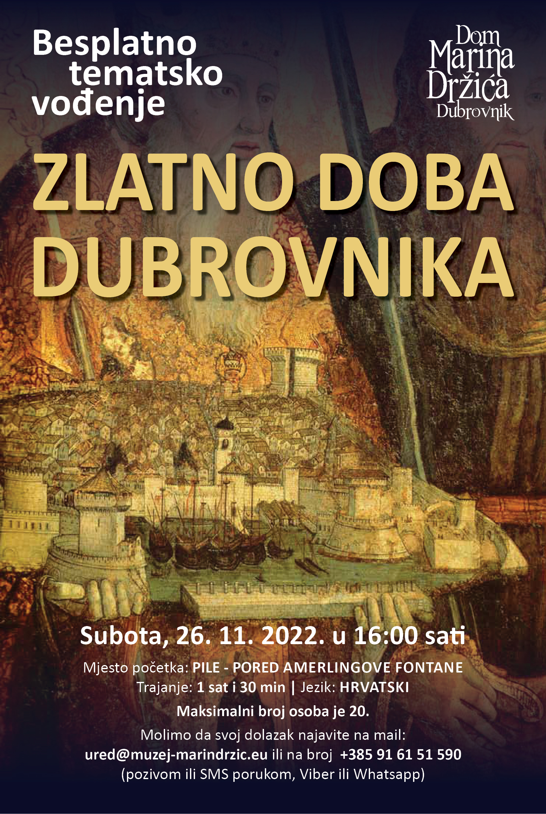 Dom Marina Držića, u sklopu Zimskog festivala, organizira besplatno tematsko vođenje „Zlatno doba Dubrovnika“ za građane i posjetitelje Grada. Nakon štose u prethodnim tematskim vođenjima upoznavo život i djelo Marina Držića, razne aspekte svakodnevnog života te suvremenike njegovog doba, u novom tematskom vođenju nastavlja se s upoznavanjem svakodnevice, ali i političke situacije Dubrovnika tijekom 15. i 16. st., tj. njegovog „zlatnog doba“. To je vrijeme kad mala, ali važna Dubrovačka Republika zaokružuje svoj teritorij, gradi vodovod, pokreće suknarsku industriju te, kako bi osigurala političku stabilnost, jedno vrijeme plaća dva danka. Ne manje važno, materijalno blagostanje i osjećaj sigurnosti bili su plodno tlo za razvoj kulture i umjetnosti. Upravo tada Marin Držić piše i prvi put u Dubrovniku izvodi svoja dramska djela, inspiriran sugrađanima i ritmom gradske svakodnevice: dočekuju se strani gosti, ispraćaju poklisari harača, kažnjavaju prijestupnici, svečanosti se obilježavaju raznim ceremonijalima, ali i zabavom za puk.